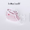 Chaussons bébé maille en laine rose et blanc, style basket avec lacet fixé à la cheville. A la fois traditionnels et modernes, ces chaussons tricotés main, ressemblent à de petites baskets stylées, ils accueilleront bébé en toute simplicité et décontraction. Joli cadeau de naissance pratique et original. Création originale La Mare'maille, tous droits réservés, reproduction interdite.